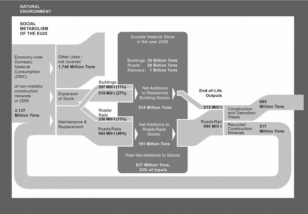 Un point important sur le dimensionnement des infrastructures est le maintien et la rénovation. Nous nous focalisons souvent à ne pas construire de nouvelles infrastructures mais nous oublions souvent que la maintenance des infrastructures existantes est responsable d’une quantité considérable. Dans cet article2, nous pouvons voir qu’au niveau européen le maintien du stock consomme plus la construction de nouveau stock.